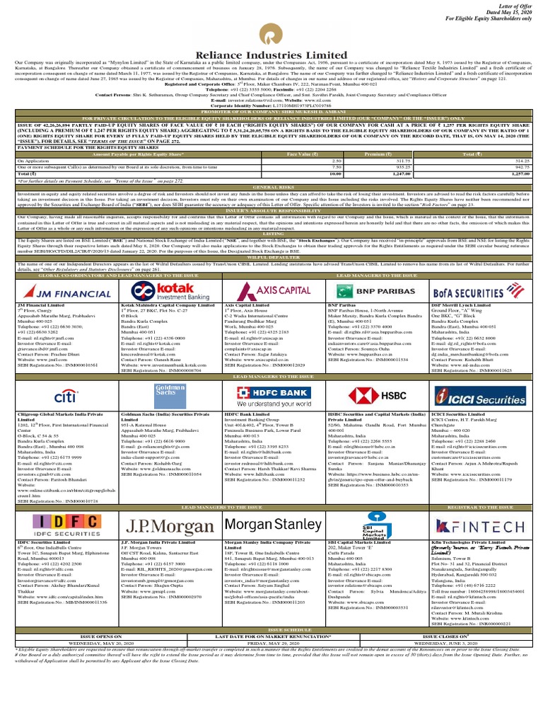 Reliance Industries Limited Letter Of Offer May 15 2020 Pdf Stocks Banks